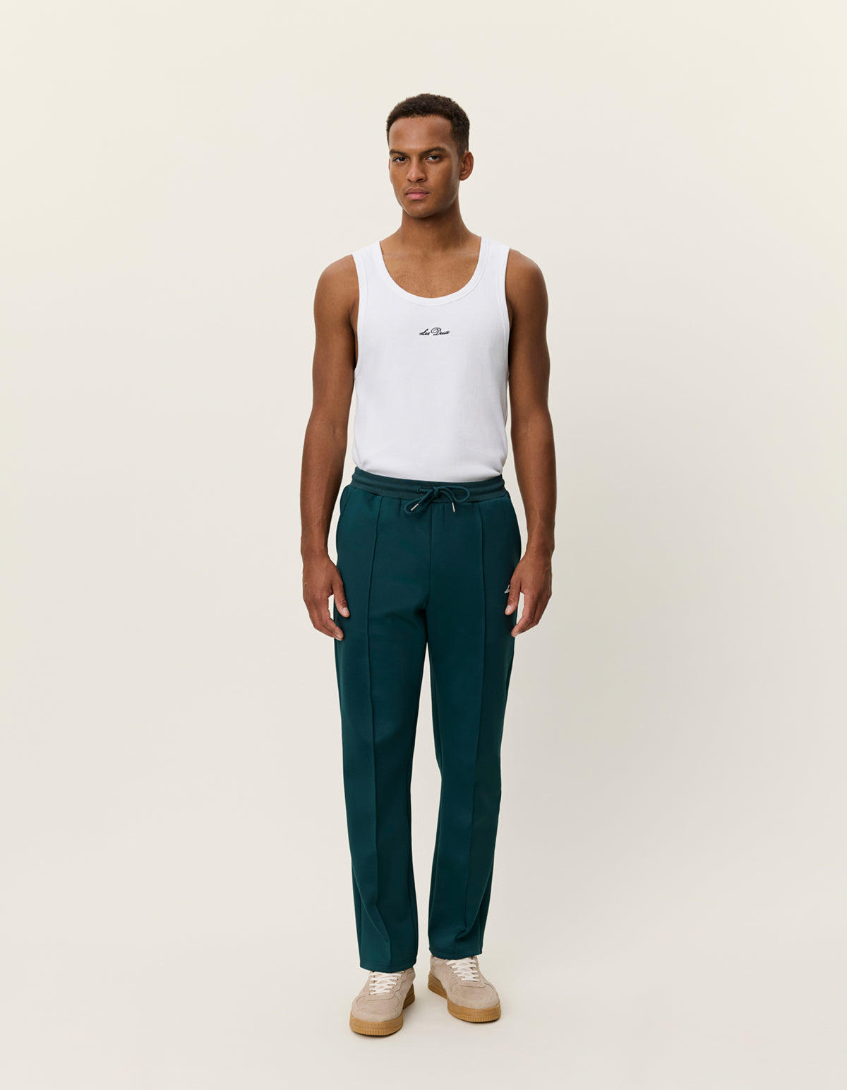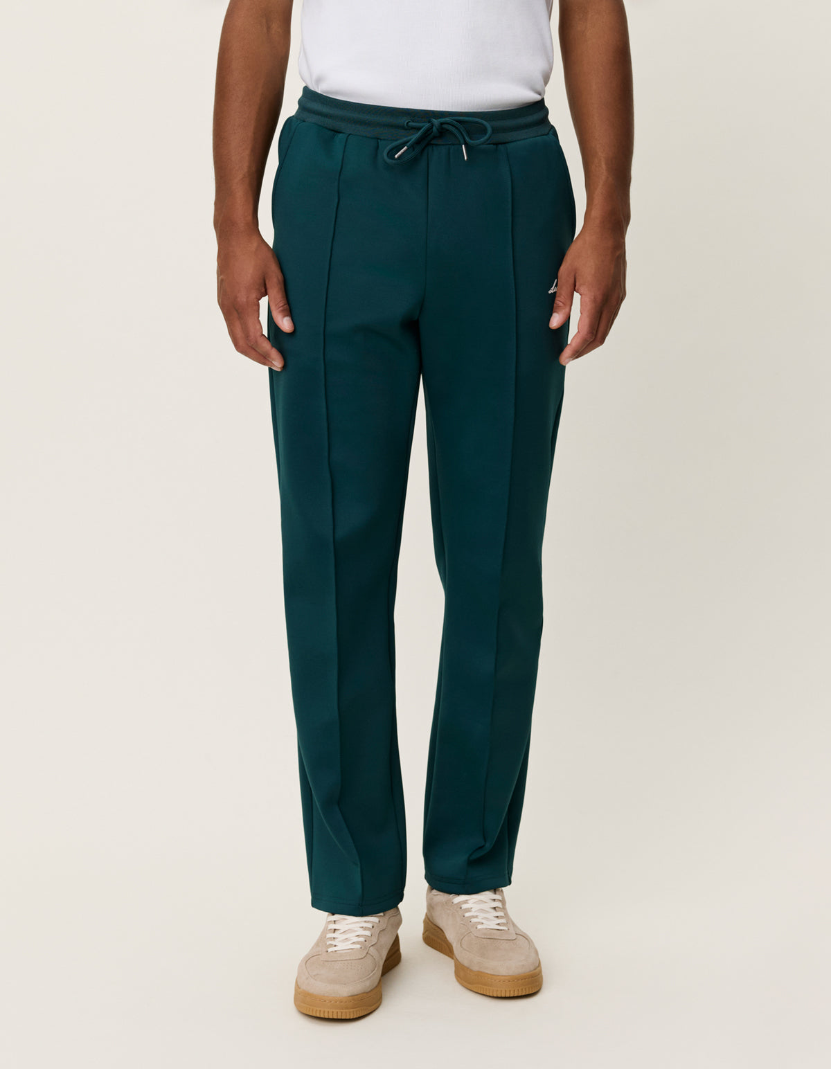 Track pants evolved. The Les Deux Ballier Crew Casual Track Pants in Sea Moss Green defy the slouch with a straight cut that demands respect. Built from 92% recycled polyester and 8% elastane, they deliver technical stretch without compromise. Stitched press folds create razor-sharp tailoring while the elastic drawstring waist keeps things relaxed. Contrast thigh artwork adds unexpected flair, and side pockets ensure function meets form. In sea moss green, these are the pants that prove athletic wear can be audaciously refined. Regular fit, zero apologies.