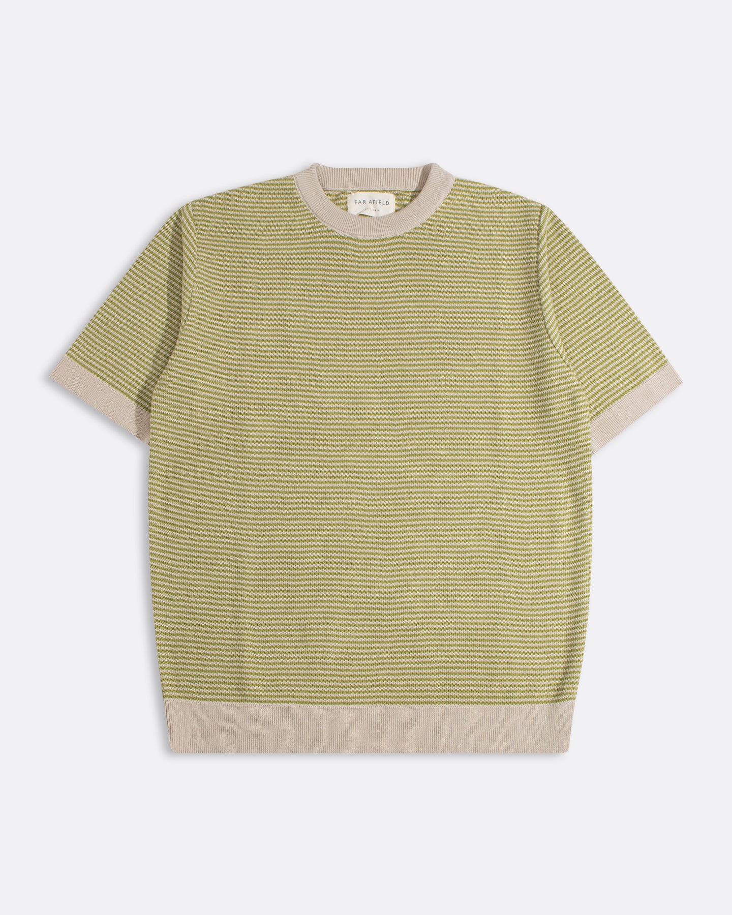 Far Afield's Newport Knitted Top in Sand-Green Stripe – understated elegance with a cheeky twist. This boxy tee showcases delicate horizontal stripes woven through a densely knitted organic cotton fabric that holds its shape beautifully. Made in Turkey from 100% organic cotton, it's the kind of everyday essential that actually feels special. Simple? Yes. Boring? Never. Layer it, tuck it, or wear it solo – this one does the heavy lifting so you don't have to.
