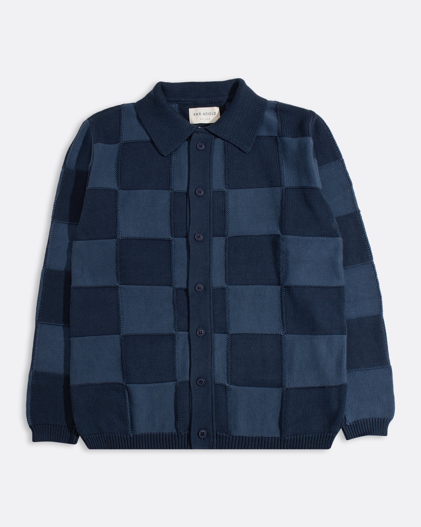 Far Afield Velzy Longsleeve Knitted Shirt in Blue Square Patchwork