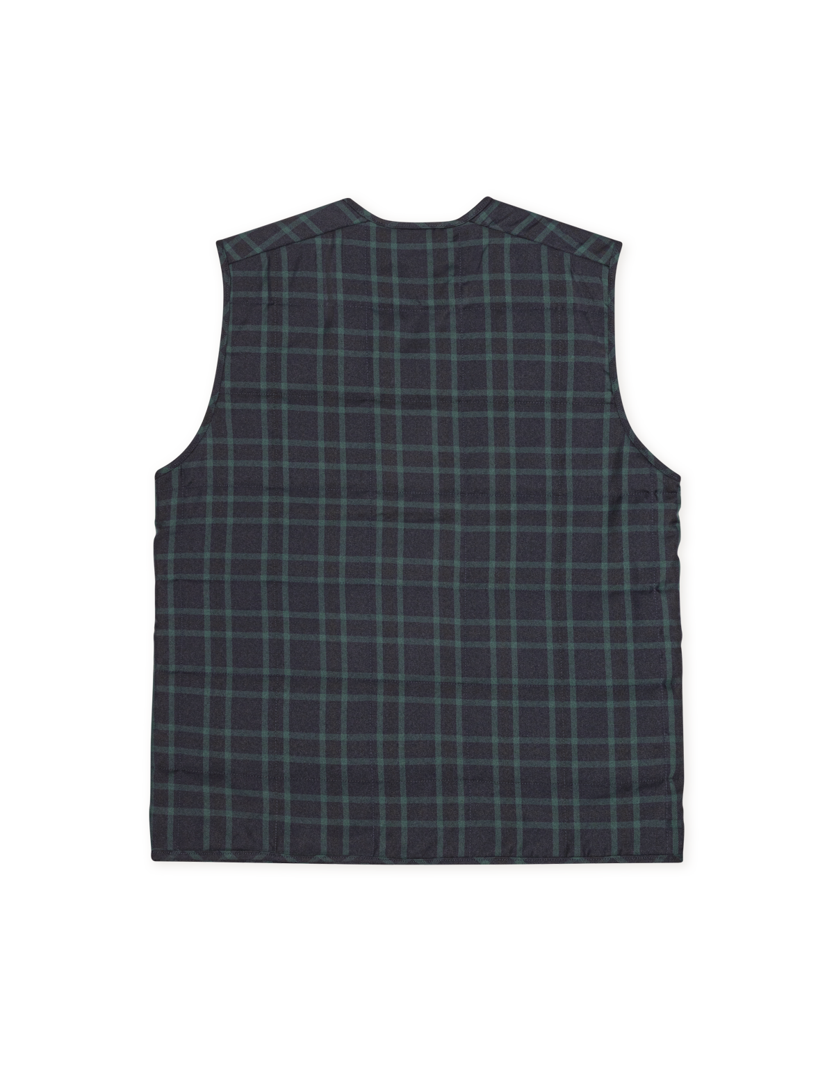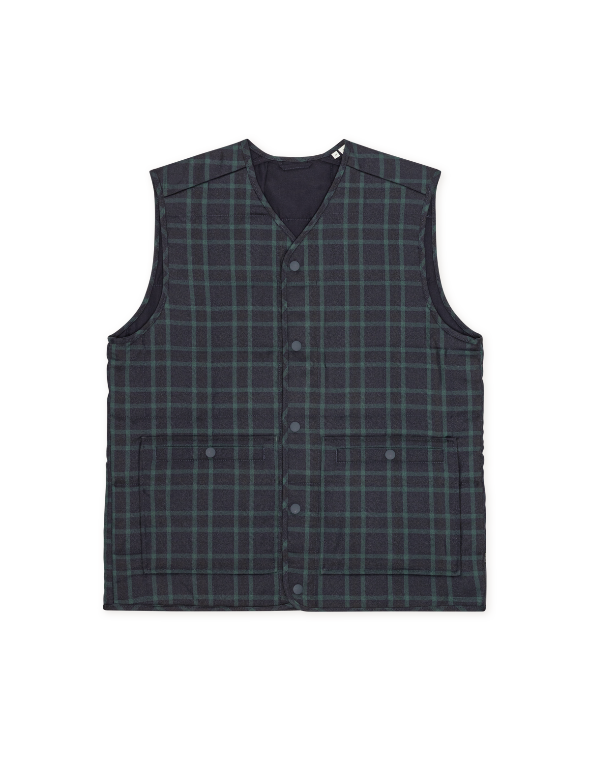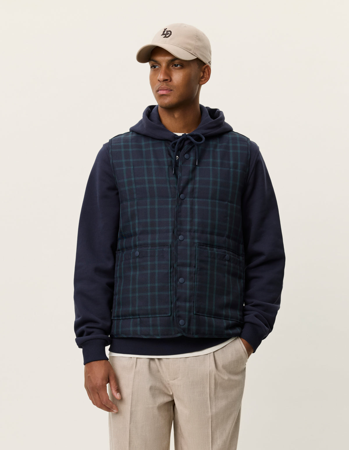 Layer like you mean it. The Les Deux Matt Quilted Check Vest in Dark Navy strips back to essentials with a checked quilted shell that proves utility can be undeniably cool. Lightweight padded construction keeps you warm without bulk while the V neckline and tonal snap button front deliver clean, no-fuss styling. Front pockets with snap closure add function, and edge-taped seams ensure precision. In dark navy, this regular-fit vest works fearlessly over sweats, shirts, or jackets. Straight hem, maximum versatility.