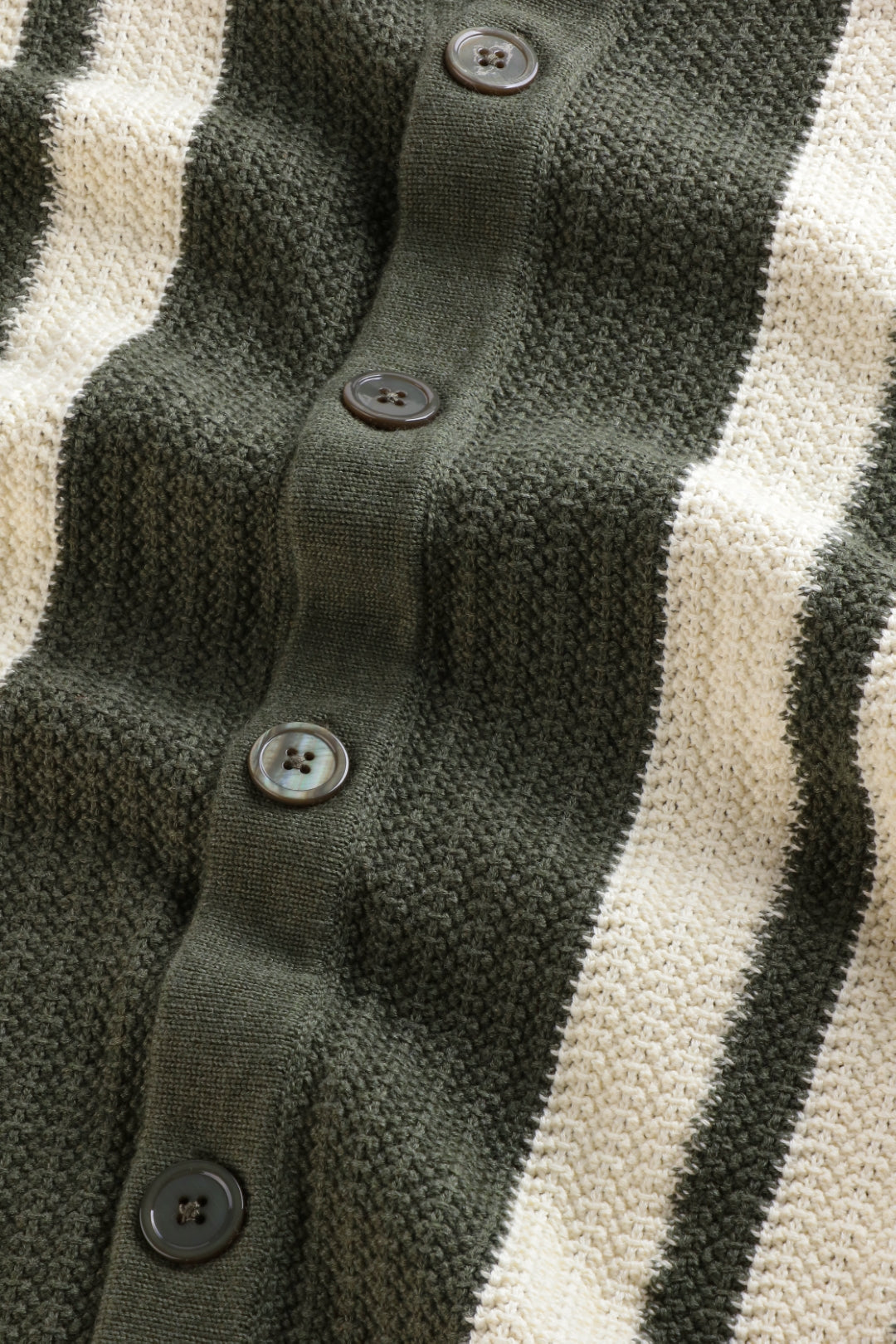 This is a Knitted shirt crafted from organic cotton. Knit in textured stitch with stripe details and finish with Mother-of-Pearl buttons.