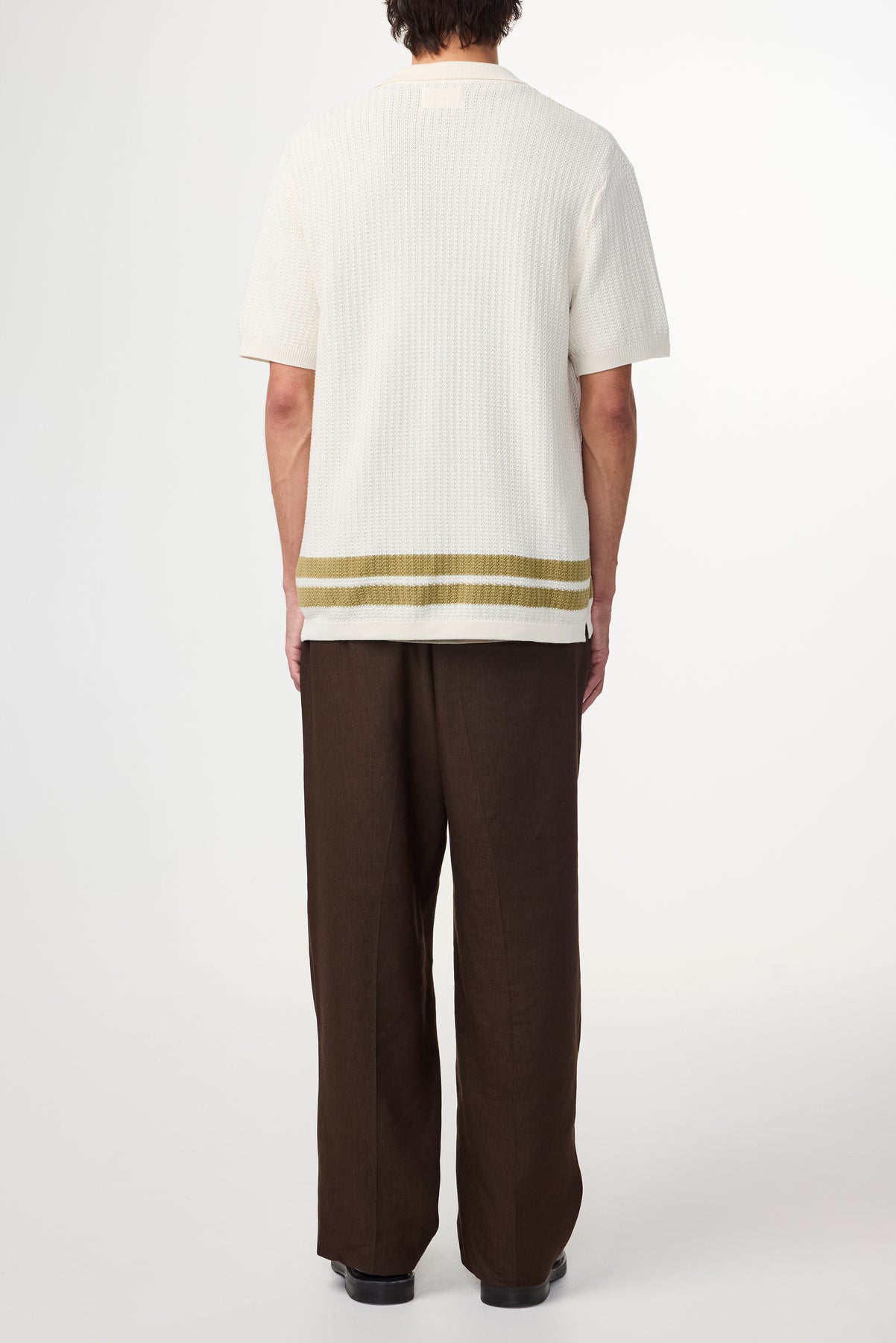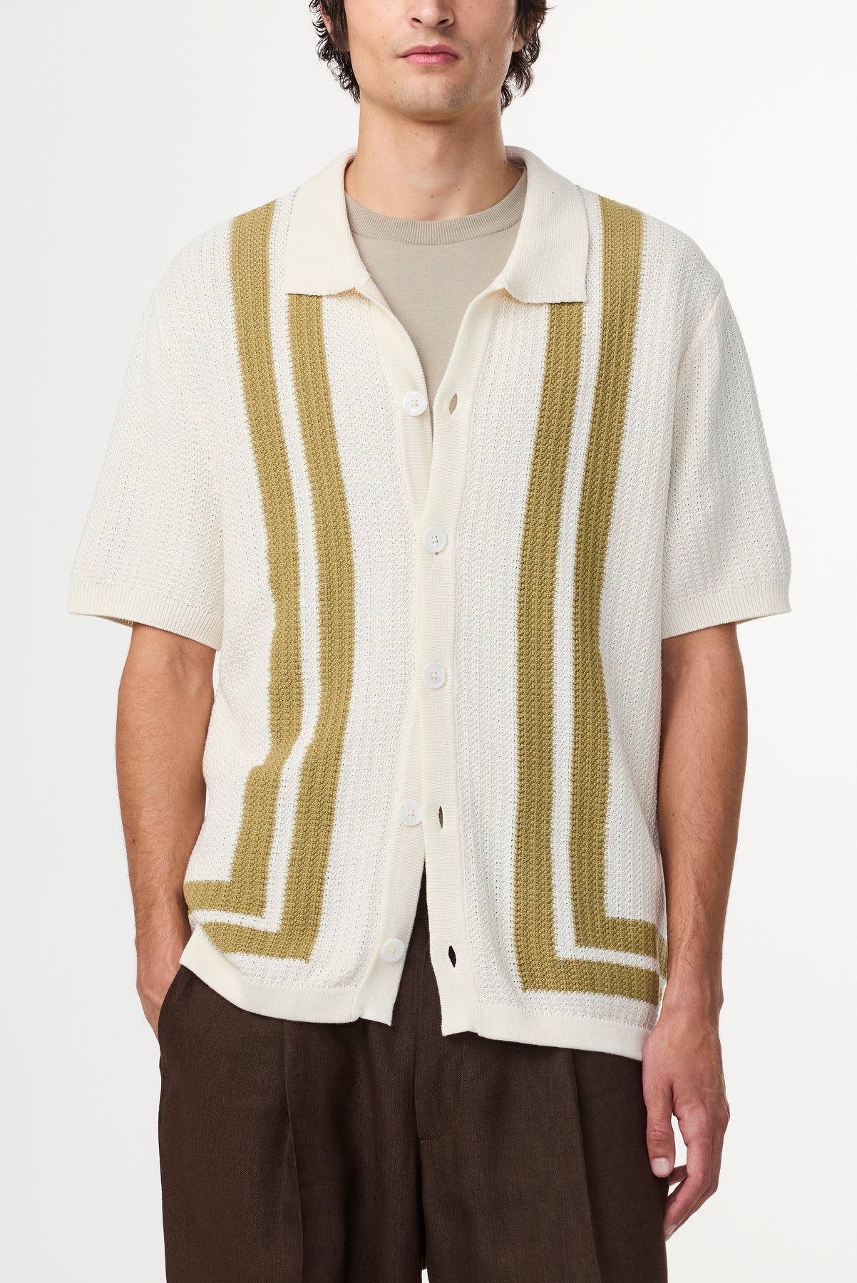This is a Knitted shirt crafted from organic cotton. Knit in textured stitch with stripe details and finish with Mother-of-Pearl buttons.
