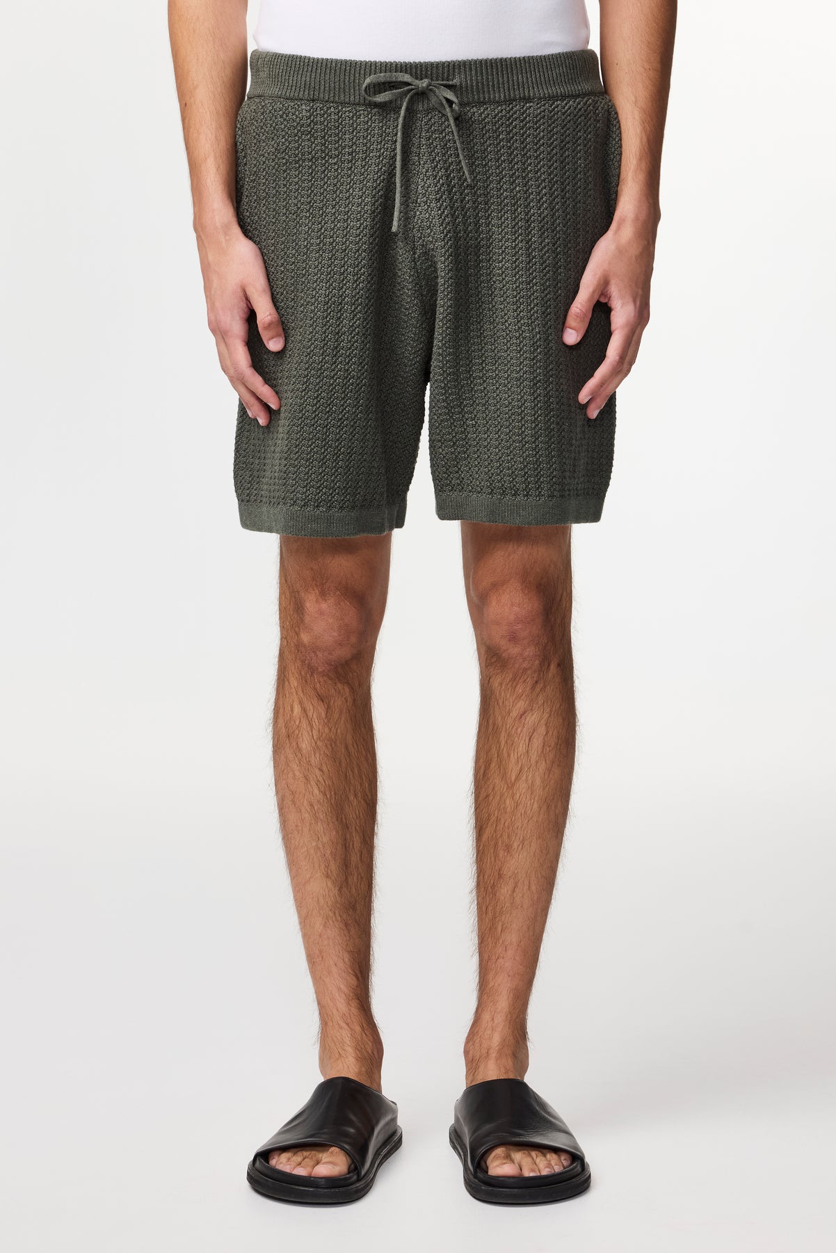 Crafted from textured organic cotton yarn with drawstrings and a single back pocket.