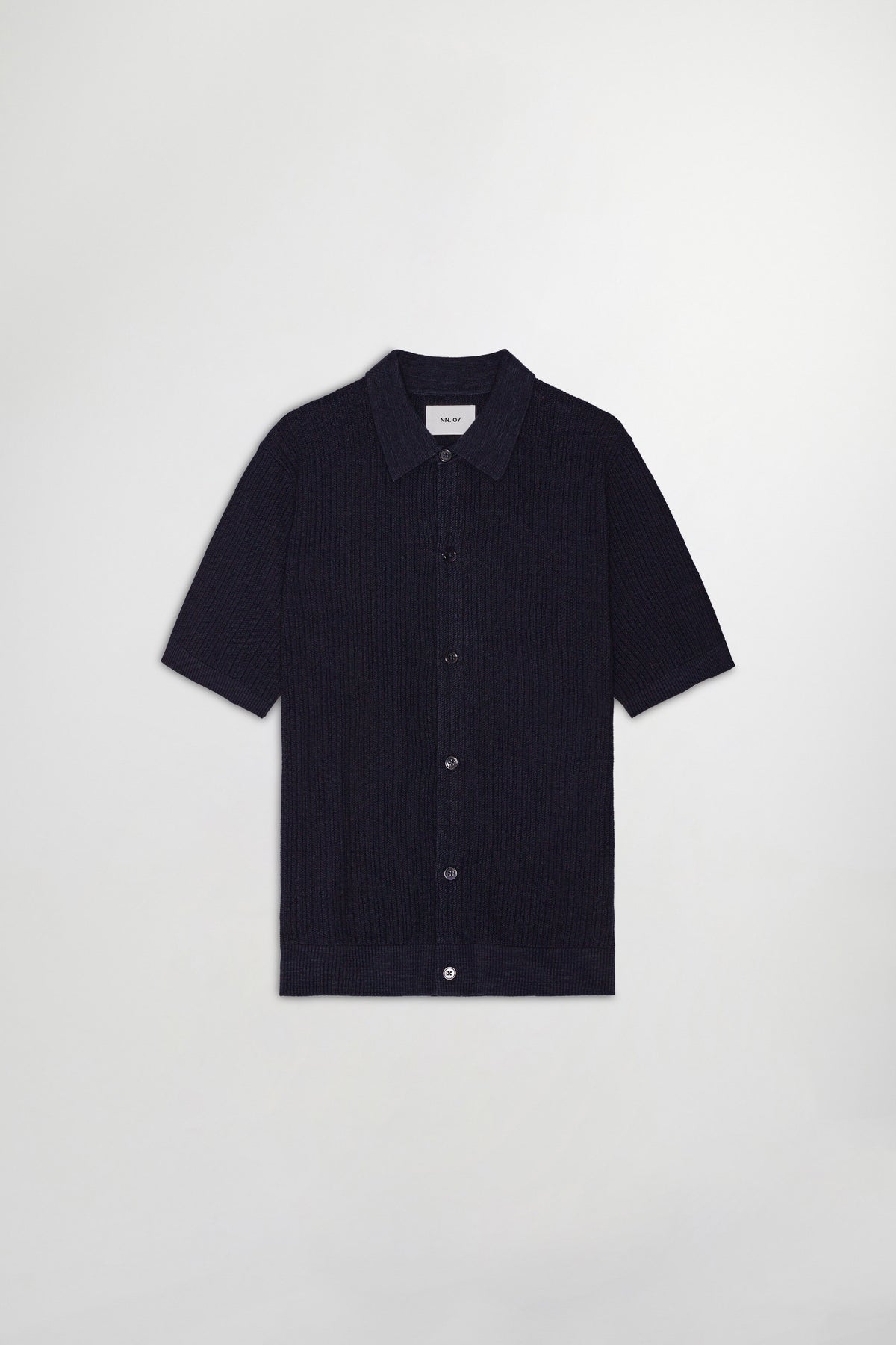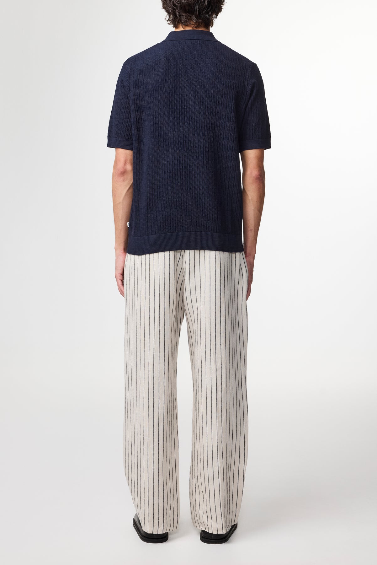 The Nolan Polo Cardigan 6695 in Navy Blue from NN07 is an open-collar polo cardigan crafted in an intricate rib organic cotton stitch with rib-knitted edges.