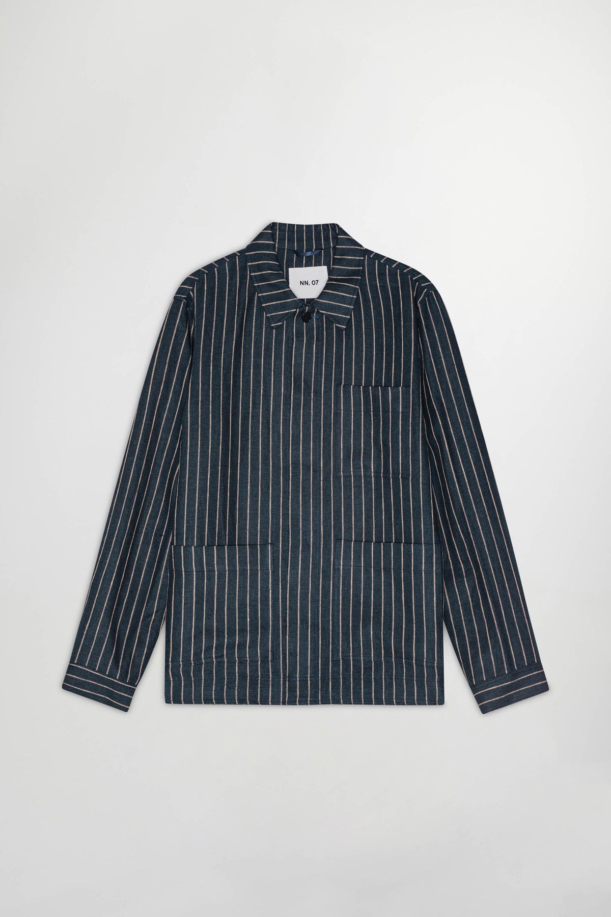 The Olav 1455 in Navy Stripe is an unlined workwear-inspired overshirt crafted from a yarn-dyed stripe European linen. Designed with a soft collar, a single chest pocket, and twin patch pockets at the waist, topped with hidden buttons under the placket.