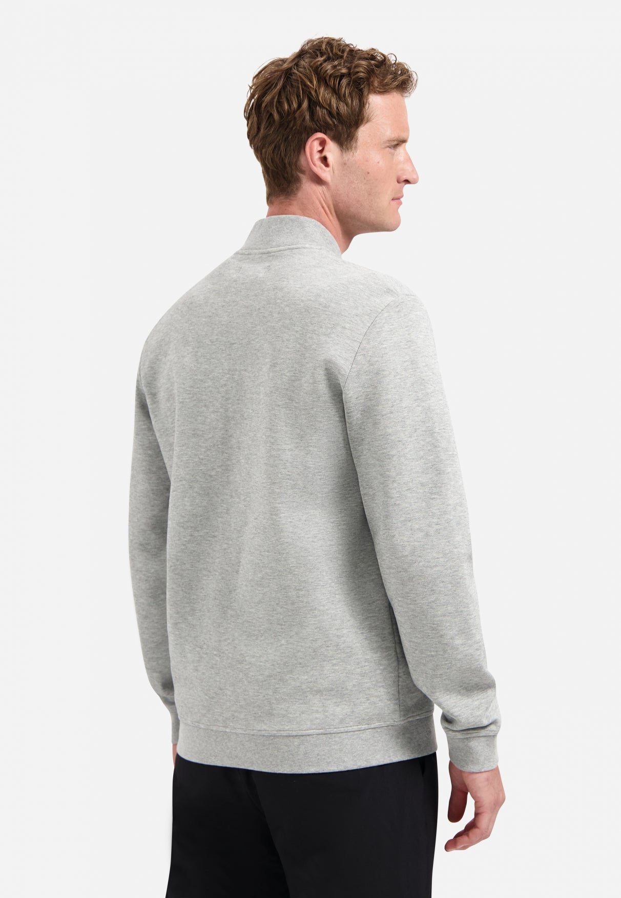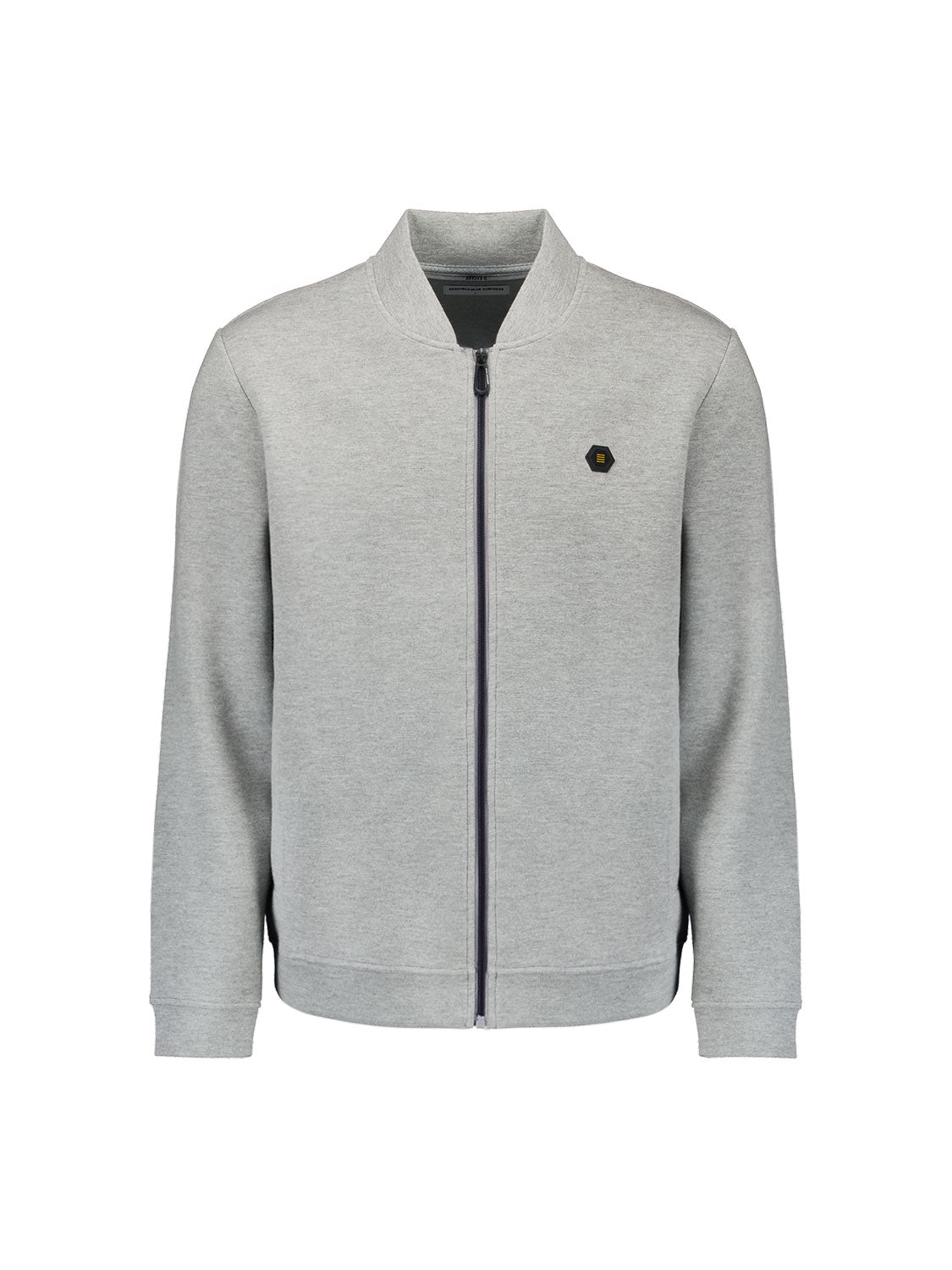 This No Excess bomber in grey melange combines premium piqué construction with understated sophistication. The bomber collar and full zip closure create a modern silhouette, while side pockets deliver practical everyday functionality. Ribbed trims at the cuffs and hem maintain structure and shape through regular wear. A subtle chest logo badge completes the refined aesthetic. Equally at home layered over basics or worn as a standalone piece, this bomber sweater transitions seamlessly across seasons and occasions.