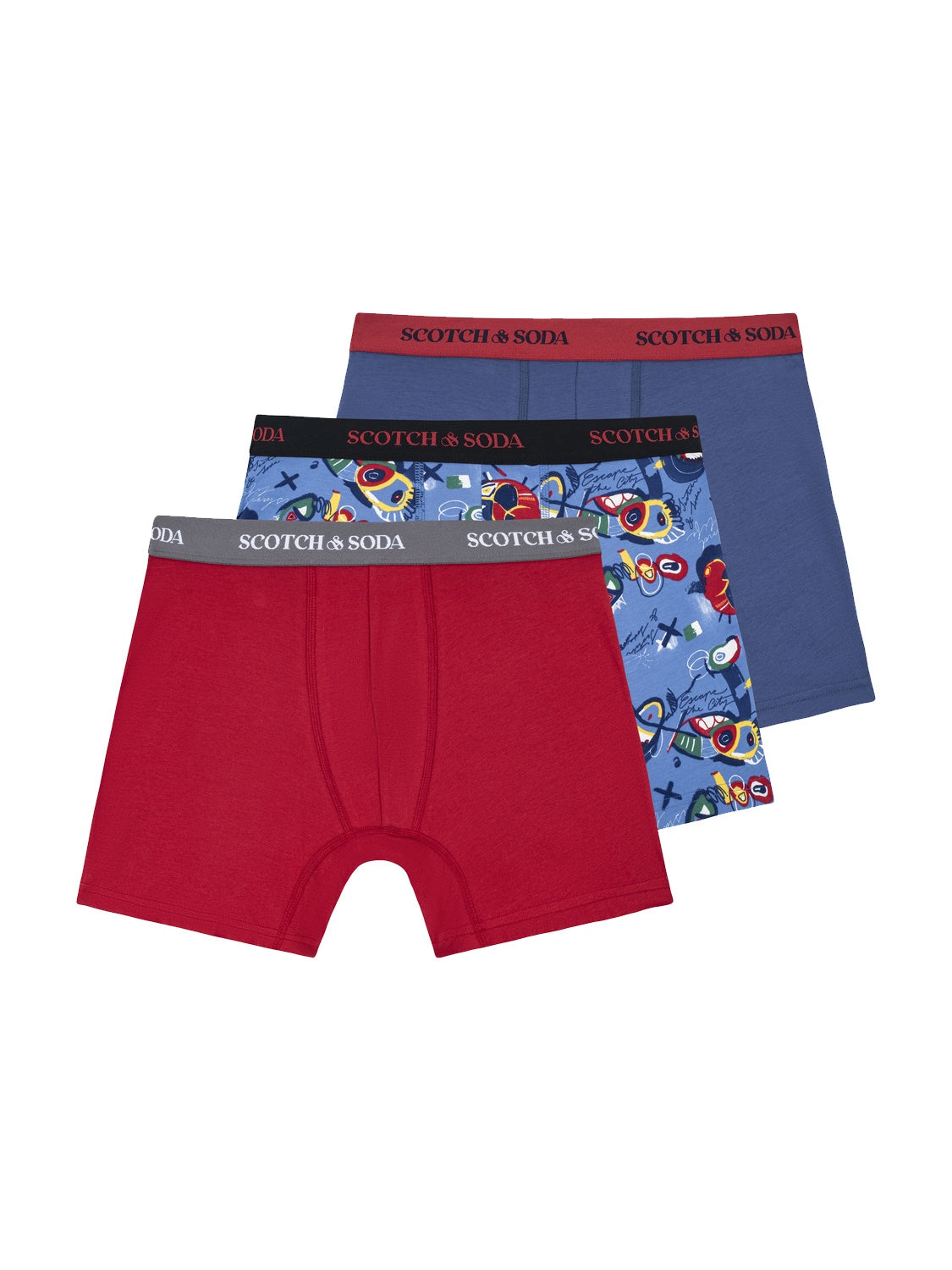 Upgrade your essentials with this 3-pack of boxer briefs in Red-Blue. Featuring two solid colours and one stylish print, these briefs are made from soft, stretchy cotton for all-day comfort. Finished with a Scotch & Soda logo waistband.